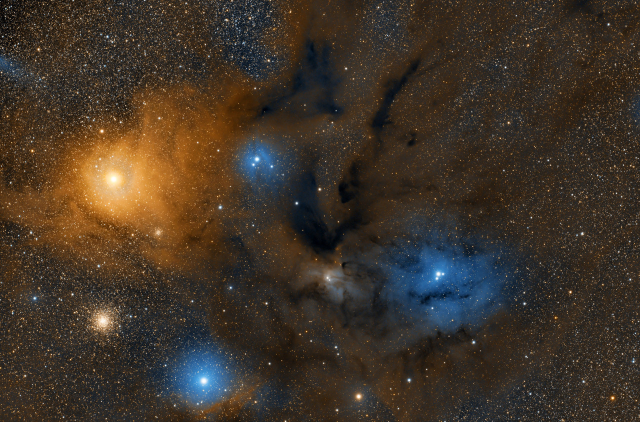 ** Refleksijske maglice (plave): Trostruka zvijezda Ro Zmijonosca osvjetljava okolnu prašinu, stvarajući ogromne, tamnoplave oblake (katalogizirane kao IC 4604).